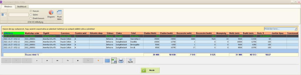 A felhasználó megadja a kezdő dátumot, záró dátumot, kiválasztja az ügyfél nevét (meg lehet jelölni azt is, hogy az összes ügyfélben keressen), beírja az egyedi cikkszámot és a program megjeleníti azokat a munkalapokat, melyek megfelelnek a beállított feltételeknek.