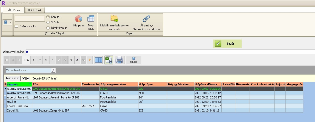 Itt lehet karbantartani az ügyfél gépeit (típus, sorozatszám, megjegyzés stb.).